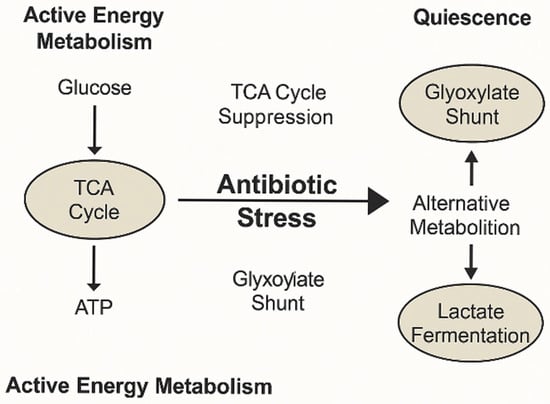 This state of reduced metabolic activity—typically associated with diminished reactive oxygen species (ROS) production, low respiration, and accumulation of toxic intermediates—has been shown to promote survival even in the absence of genetic alterations, as demonstrated in Escherichia coli and Staphylococcus aureus [,,].