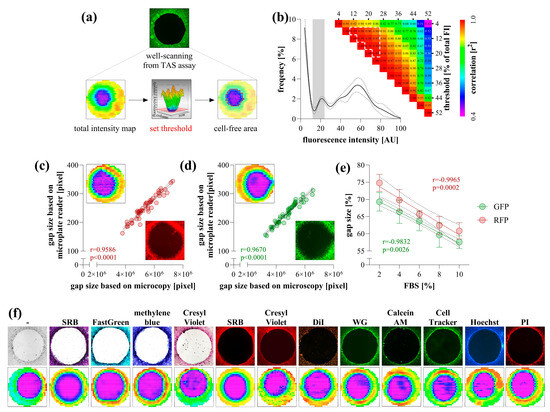 Data acquisition of transient agarose spot (TAS) assay using microplate reader. The well-scanning mode of the microplate reader generates an intensity heatmap of a whole well, where the cell-free area can be defined by setting a threshold value (a). The accuracy of threshold selection was evaluated using TAS assay wells containing GFP-expressing HCT-116 cells (n = 50) (b). Based on the intensity distribution of heatmap pixels, different threshold values were selected to determine cell-free areas, and a correlation matrix was generated. A nearly perfect correlation was observed for threshold values between 10 and 25% of the maximal intensity (highlighted with white outline). Validation of the microplate-based detection was carried out by correlating gap sizes with microscopy-based measurements for RFP- (c) and GFP-expressing (d) HCT-116 cells (n = 50). The applicability of microplate reader-based quantification was investigated on RFP- and GFP-expressing HCT-116 cells after their stimulation with a dilution series of fetal bovine serum (FBS) for 72 h (n = 10/group) (e). Various colorimetric and fluorescent stains were tested on non-fluorescent HCT-116 cells (f). The same wells were captured by microscopy (top, using 4× magnification) and microplate reader (bottom). Heatmaps represent well-scanning fluorescence intensity data, where color gradients correlate with signal strength across the scanned area. Significance values (p) and Pearson’s correlation coefficients (r) are indicated.