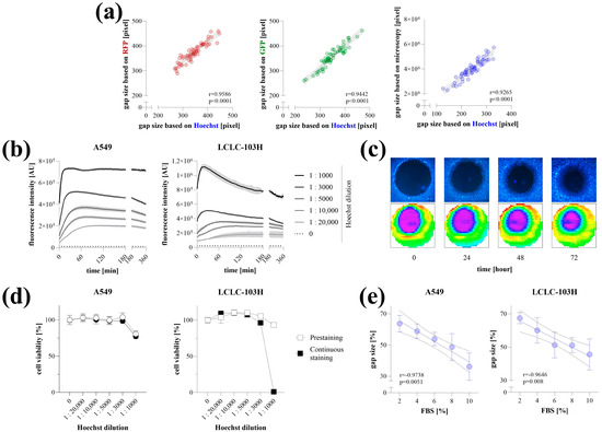 Optimization of Hoechst-staining. Validation of Hoechst staining for microplate-based detection was carried out in fluorescent and native HCT-116 cells (a). Gap areas determined by Hoechst fluorescence intensity (pre-stained cells for 4 h at 1:10,000 concentration) were correlated with RFP and GFP signals, as well as microscopy-based quantification (n = 50, using 4× magnification). Staining kinetics with various Hoechst concentrations were investigated on A549 and LCLC-103H cells (n = 5/group) with two-minute interval detection (b). The stability of Hoechst fluorescence signal and its detection with microscope (top) or microplate reader (bottom) was investigated for 72 h (c). The cytotoxicity of Hoechst staining was investigated on A549 and LCLC-103H cells using MTT cell viability assay following a 4 h prestaining or continuous staining for 72 h at 1:10,000 concentration (d). The applicability of microplate reader-based quantification was investigated on Hoechst-stained A549 and LCLC-103H cells after their stimulation with a dilution series of fetal bovine serum (FBS) for 72 h (n = 10/group) (e). Heatmaps represent well-scanning fluorescence intensity data, where color gradients correlate with signal strength across the scanned area. Results are presented as mean ± SD. Significance values (p) and Pearson’s correlation coefficients (r) are indicated.