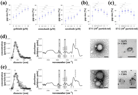 Representative experiments of microplate-based transient agarose spot (TAS) cell migration assay. Hoechst-stained A549 cells were stimulated with 10% FBS and the antimigratory effect of gefitinib, nintedanib, and sorafenib kinase inhibitors, (a) as well as EV1 (b) and EV2 (c) MSC-derived extracellular vesicles, was investigated after 72 h via microplate-based quantification (n = 10/group). Results are presented as mean ± SD. * p < 0.05; ** p < 0.01; *** p < 0.001; (Brown–Forsythe and Welch ANOVA with Dunnett’s T3 test). Characterization of EV1 (d) and EV2 (e) samples was carried out by determining nanoparticle size distribution using nanoparticle tracking analysis, measuring protein and lipid content using surface-enhanced Fourier transform infrared spectroscopy, investigating morphology and structure using transmission electron microscopy (TEM), and demonstrating the presence of ALIX1 and CD81 markers by immuno-TEM using 5 and 10 nm gold labeled antibodies. Scale bar: 100 nm.