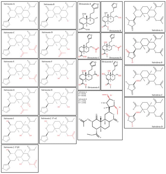 - Kutrzeba, L.M.; Ferreira, D.; Zjawiony, J.K. Salvinorins J from Salvia divinorum: Mutarotation in the Neoclerodane System. J. Nat. Prod. 2009, 72, 1361–1363. [Google Scholar] [CrossRef]