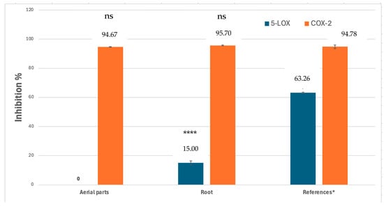 5-LOX and COX-2 enzyme inhibition values of S. salviifolia extracts at 400 µg/mL final concentration (* Zileuton for 5-LOX and celecoxib for COX-2, ns: not significant, **** p < 0.0001).