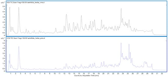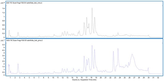 Total ion chromatogram (TIC) of S. salviifolia aerial part extract in negative (above) and positive (below) ionization modes.