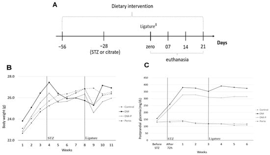 (A) Experimental design; ‡ inoculation with live Porphyromonas gingivalis in 2% CMC every 2 days for 3 times. (B) Body weight (g) of the animals throughout the study period, presented as the weekly mean. (C) Postprandial blood glucose (mg/dL) of the animals throughout the study period (46 days), presented as the weekly mean. STZ—streptozotocin.