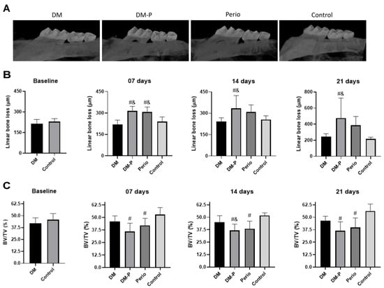 In terms of alveolar bone volume loss (BV/TV%) (Figure 2C), and similar to the findings from the linear measurements, both groups subjected to experimental periodontitis induction exhibited significant lower bone volume in the region between the first and second maxillary molars than in the Control group (Perio group: 7 days: p = 0.0285, 14 days: p = 0.0008, 21 days: p = 0.0045; DM-P group: 7 days: p = 0.0006, 14 days: p = 0.0002, 21 days: p = 0.0013). While the DM-P group demonstrated greater tissue impairment, no significant differences were observed compared with the Perio group (7 days: p = 0.3206; 14 days: p = 0.9401; 21 days: p = 0.8366). Interestingly, the DM group showed a slight decrease in BV/TV compared with the control group throughout the evaluation period, but no significant differences between the groups were observed (baseline: p = 0.0714; 7 days: p = 0.3138; 14 days: p = 0.1506; 21 days: p = 0.2138).