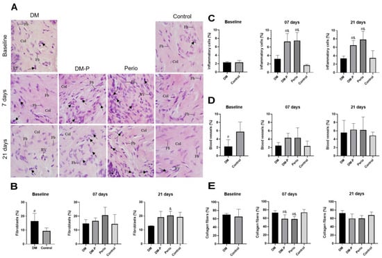 (A) Light micrographs of portions of gingival mucosa showing the lamina of mice. Arrow—inflammatory cell; Fb—fibroblasts; BV—blood vessel; ET—epithelial tissue; Col—collagen fibers. Scale Bars: 35 µm. (B–E) Graphics illustrating the volume density of fibroblasts (B), inflammatory cells (C), and blood vessels (D) and volume density of collagen fibers in the lamina propria of gingival mucosa of mice from DM, DM-P, Perio, and Control groups. # Significant difference compared with the Control group; & significant difference compared with the DM group. Values expressed as mean and standard deviation.