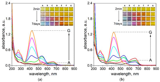 The UV–Vis spectra of solutions containing the mixture of Pd(II) ions with TR OO at different volume ratios of Pd(II) to TR OO: A—3.5:0.5; B—3.0:1.0; C—2.5:1.5; D—2.0:2.0, E—1.5:2.5; F—1.0:3.0; G—0.5:3.5 (mL/mL) at temperatures of 20 °C (a) and 50 °C (b). The UV–Vis was registered after 7 days in ethanol. Conditions: the value of concentration before reagent mixing: C0,TR OO=Pd(II) = 5 × 10−5 mol/dm3, path length 1 cm. Assignment of recorded spectrum colors to samples: Sample A—black; B—red; C—green; D—dark blue; E—blue; F—pink and G—orange.