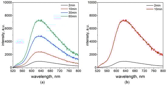 The fluorescence emission spectra solution containing the mixture of TR OO with Pd(II) ions at temperatures of 20 °C (a) and 50 °C (b) over time from 2 min to 60 min. Conditions: volumetric ratio, 3.0 mL Pd(II)/1.0 mL TR OO; the value of concentration before reagent mixing, C0,TR OO,Pd(II) = 5 × 10−5 mol/dm3; path length, 1 cm.