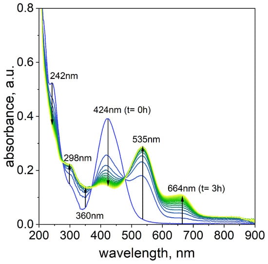 The proposed reaction pathway suggests that A component, located at 424 nm, decreases in intensity over time. Simultaneously, increasing intensities of the new maxima at 535 and 664 nm were observed as the reaction progressed. In the reaction pathway (1), the new maxima suggest the formation of components B and C, which is related to the formation of intermediates and final products over time.