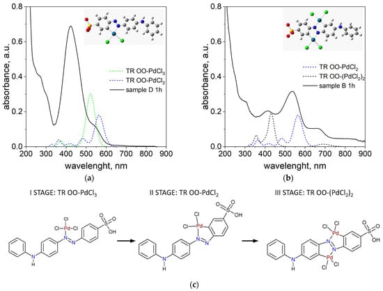 As proposed in our previous work [], the appearance of a peak around 500 nm is attributed to the formation of Pd-N and Pd-C bonds within the phenyl ring of TR OO. To confirm this, DFT calculations were performed for model complexes containing 1 and 2 Pd atoms attached to one TR OO molecule, designated TR OO-PdCl2 and TR OO-(PdCl2)2, respectively. Theoretical spectra calculated for these complexes were compared with experimental spectra measured for solutions in which the Pd/TR OO ratio was 1:1 (sample D) and 3:1 (sample B) (see Figure 4a,b). Detailed analysis of theoretical and experimental data confirmed the multi-stage formation of the organometallic complex (see Figure 4c).