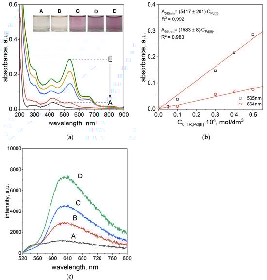 Spectra of solutions containing mixture of TR and Pd(II) ions after 1 h (a); dependency of absorbance vs. initial concentration of Pd(II) ion after 1 h, A: 5 × 10−6 mol/dm3; B: 1 × 10−5 mol/dm3; C: 3 × 10−5 mol/dm3; D: 4 × 10−5 mol/dm3, E: 4 × 10−5 mol/dm3. Assignment of recorded spectrum colors to samples: Sample A—black; B—red; C—blue; D—orange; E—dark green. (b) Fluorescence emission spectra registered after 10 min A: 5 × 10−6 mol/dm3; B: 1 × 10−5 mol/dm3; C: 3 × 10−5 mol/dm3; D: 5 × 10−5 mol/dm3 (c). Conditions: T = 50 °C, path length 1 cm.