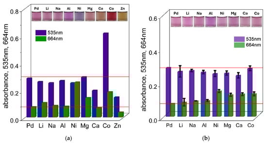 The value of absorbance at wavelengths of 535 nm and 664 nm for solutions containing Pd(II) ions with TR OO and Pd(II)–TR OO with metal cations—Li+, Na+, Al3+, Ni2+, Mg2+, Ca2+, and Co2+—at concentrations of 0.1 mol/dm3 (a) and 0.01 mol/dm3 (each measurement was performed in triplicate (n = 3), error bars represent standard deviation) (b), after 1 h in ethanol. Conditions: C0,TR OO = 1.25 × 10−5 mol/dm3, C0,Pd(II) = 3.75 × 10−5 mol/dm3, volumetric ratio mixing of Pd(II) ions and TR OO = 3.0 mL: 1.0 mL, T = 50 °C.