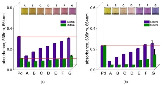 The values of absorbance at wavelengths of 535 nm and 664 nm for solutions containing Pd(II) ions, TR OO, and Zn2+, at different concentrations of Zn2+—A: 1 × 10−1 mol/dm3; B: 5 × 10−2 mol/dm3; C: 1 × 10−2 mol/dm3; D: 5 × 10−3 mol/dm3; E: 1 × 10−3 mol/dm3; F: 5 × 10−4 mol/dm3; G: 1 × 10−4 mol/dm3 (measurement was performed in triplicate (n = 3); error bars represent standard deviation)—after 1 h (a) and 24 h (b) in ethanol. Conditions: C0,TR OO = 1.25 × 10−5 mol/dm3, C0,Pd(II) = 3.75 × 10−5 mol/dm3, volumetric ratio mixing of Pd(II) ions and TR OO = 3.0 mL: 1.0 mL, T = 50 °C.