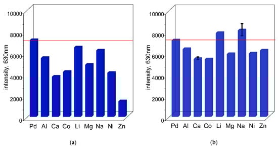 The value of fluorescence obtained at 630 nm for solutions containing TR OO with Pd(II) ions and metal cations—Al3+, Ca2+, Co2+, Li+, Mg2+, Na+, Ni2+, and Zn2+—at concentrations of 0.1 mol/dm3 (a) and 0.01 mol/dm3 (0.0001 mol/dm3 for Zn2+) (b), after 10 min in ethanol. Conditions: C0,TR OO = 1.25 × 10−5 mol/dm3, C0,Pd(II) = 3.75 × 10−5 mol/dm3, volumetric ratio mixing of Pd(II) ions and TR OO = 3.0 mL: 1.0 mL, T = 50 °C.