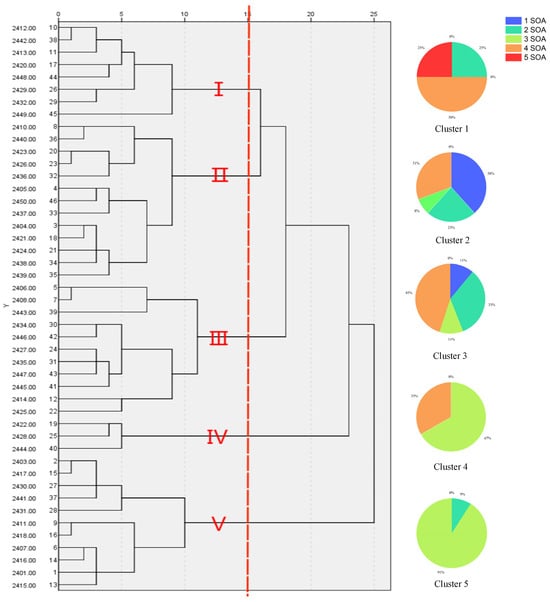 After standardizing the mean value of the quantitative indexes of various populations, a cluster analysis map was drawn using the results of the nine standardized quantitative indicators. I–V represent the five cluster groups obtained based on the results of cluster analysis. Hierarchical cluster analysis for the 46 Echinochloa spp. and the herbicide resistance status for the ecotypes grouped within each cluster are shown in pie charts. Colors indicate resistance to one or more herbicide sites of action (SOAs). For example, 2 SOAs represents the presence of two different sites of action of fresh weight inhibition by herbicides of less than 78%.