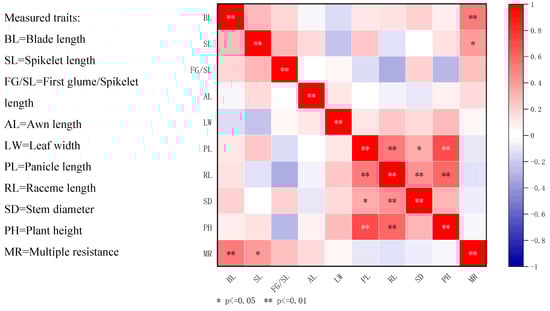 Correlation analysis between herbicide resistance status and the 8 morphophysiological traits measured in 46 Echinochloa ecotypes. The eight morphological traits correlated with multiple resistance are shown in the figure’s bottom row or right column. Information regarding the “Correlation between population morphology and multi-resistance” can be found in Appendix D, Table A4. ** p ≤ 0.01, * p ≤ 0.05.