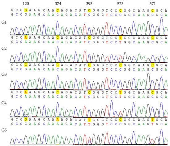 ITS sequence difference sites and corresponding clustering patterns. The ITS single-nucleotide polymorphism (SNP) sites depicted in the figure correspond to specific positions within the known ITS sequences of reference strain KP711096.1 (GenBank accession number). Group designations (G1–G5) are assigned to represent distinct genotypes identified through phylogenetic analysis. Each group (G1, G2, G3, G4, G5) encompasses sequences sharing unique SNP profiles, reflecting evolutionary divergence or ecological adaptation.