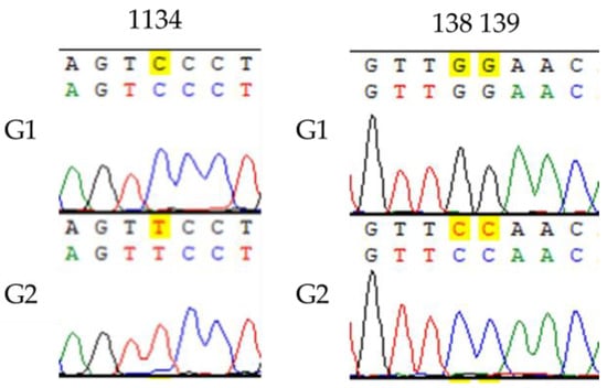 matK and psbA sequence difference sites and corresponding clustering patterns. Left figure: matK; right figure: psbA. The psbA and matK SNP sites in the figure correspond to the sites in the known sequences of HQ600076.1 and AF164422.1 in Genbank, respectively. G1 and G2 represent the different genotypes.