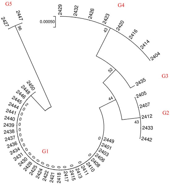 Cluster analysis of ITS in 46 populations. Through phylogenetic analysis utilizing ITS barcoding, 46 populations have been categorized into 5 distinct clusters, which are designated as group designations (G1–G5) to represent distinct genotypes.