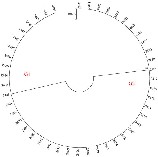 Cluster analysis of psbA and matK in 46 populations. Through phylogenetic analysis utilizing psbA and matK barcoding, 46 populations have been categorized into 2 distinct clusters, which are designated as group designations (G1 and G2) to represent distinct genotypes.