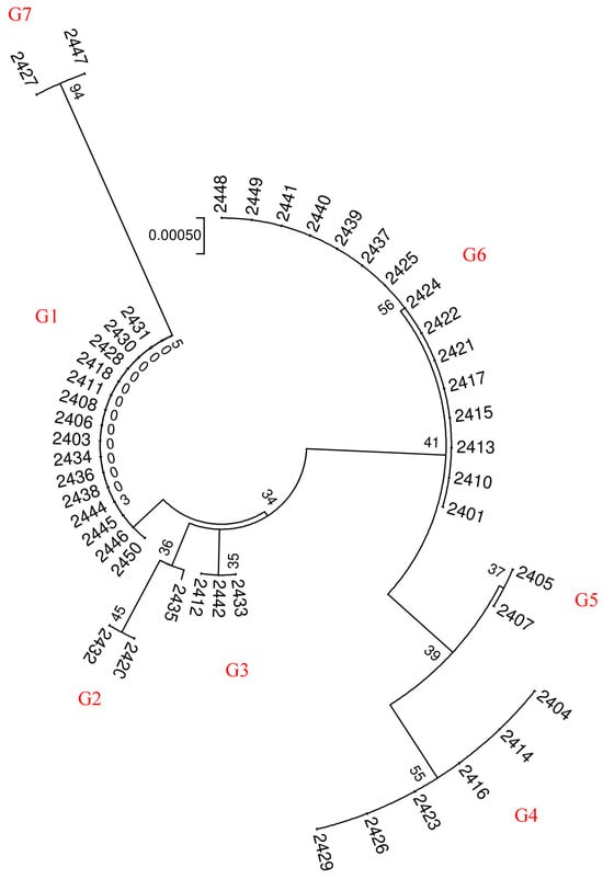 Cluster analysis of ITS + psbA in 46 populations. Through phylogenetic analysis utilizing ITS + psbA barcoding, 46 populations have been categorized into 7 distinct clusters, which are designated as group designations (G1–G7) to represent distinct genotypes.