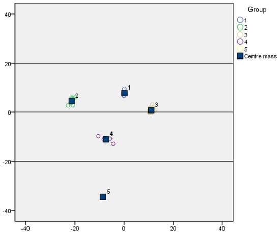 The clustering results revealed that Groups 1 and 2 are genetically closer to each other, with their centroids (dark blue squares) positioned near each other in the diagram, indicating a high degree of similarity between these two groups of samples in terms of SCoT molecular markers. In contrast, Group 5 displayed substantial genetic differences from the other groups, with its centroid located far from those of the other groups in the diagram, showcasing unique genetic characteristics.