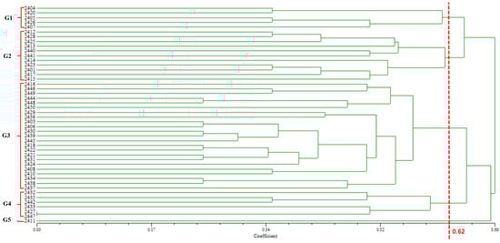 We constructed a cluster analysis graph utilizing the specificity matrix. The coefficients of variation among the 46 barnyard grass samples ranged from 0.00 to 0.69 (Figure 9). Most samples exhibited coefficients of variation between 0.24 and 0.69, indicating substantial differences among the samples collected in this experiment. With a genetic coefficient of variation set at 0.62, the 46 barnyard grass samples were divided into five groups, aligning with the clustering observed in the ITS DNA barcodes, potentially due to variations in intraspecific identification among different molecular markers. Notably, SCoT molecular markers exhibited a higher discriminatory capacity in the species.