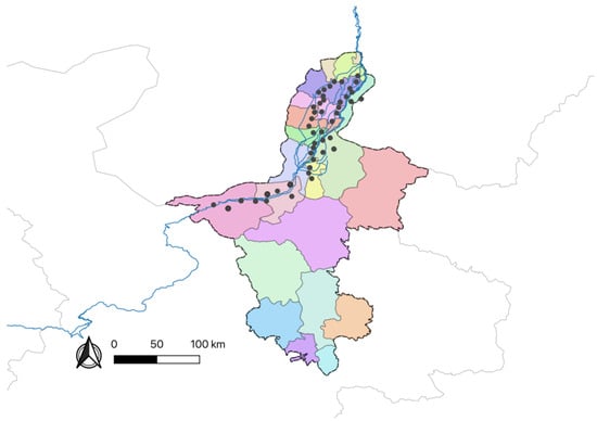 Sampling locations (n = 46) are marked with black dots corresponding to different populations.