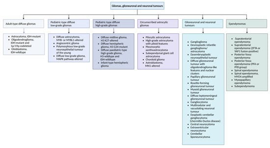 Overview of the World Health Organization 2021 central nervous system glial, glioneuronal, and neuronal tumor classification. Created in BioRender. Gonçalves Meleiro, M. (2025). https://BioRender.com/7tu8grq (accessed on 27 April 2025).