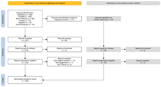 The search strategy included the terms “glioblastoma”, “epigenetic”, and “therapeutic targeting”, along with MeSH terms, synonyms, and appropriate filters. The final PubMed search string was as follows: “(Glioblastoma epigenetic therapeutic targeting) NOT (review[pt])”, with filters applied for full text, English language, publication within the last 10 years, and exclusion of preprints. A manual search, primarily through backward citation tracking, was also conducted to identify additional relevant studies.