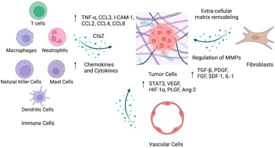 | Tumor-Associated Macrophages (TAMs) | Colony stimulating factor (CSF-1) [20] Cathepsin Z (CtsZ) [21] CEACAM5 [21] Tie-2 [23] | |