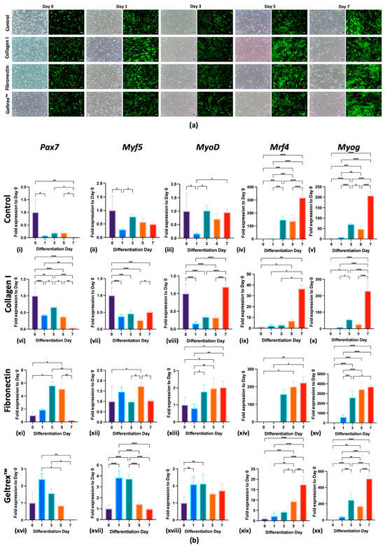 2.1. Collagen I, Fibronectin, and Geltrex™ Induced Myogenic Differentiation Comparable to the Control Condition