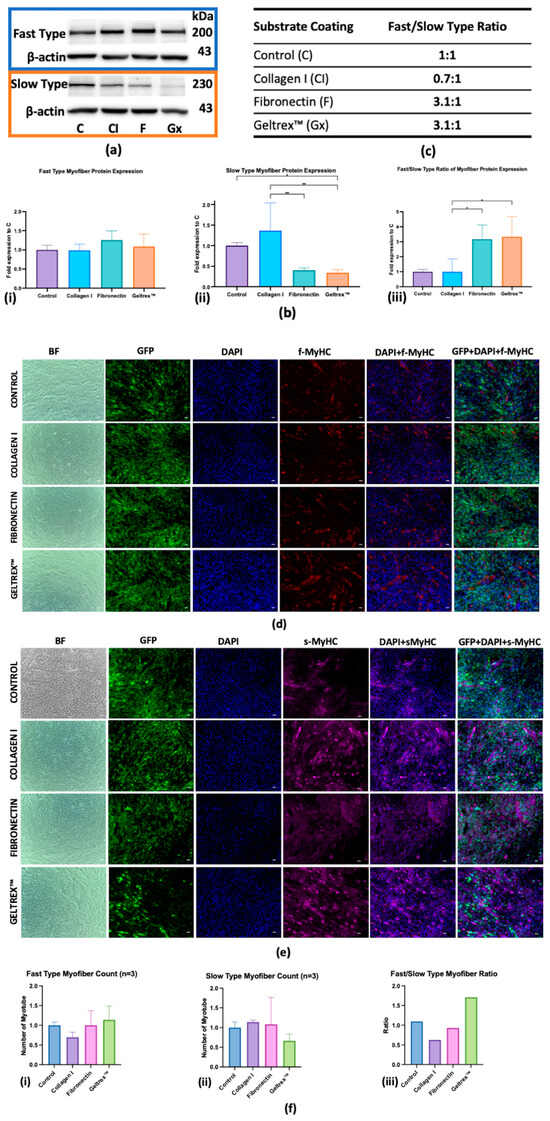 2.2. Collagen I Enhanced Slow Myofibers Protein Expression, Whereas Fibronectin and Geltrex™ Favored Fast Myofibers Protein Expression