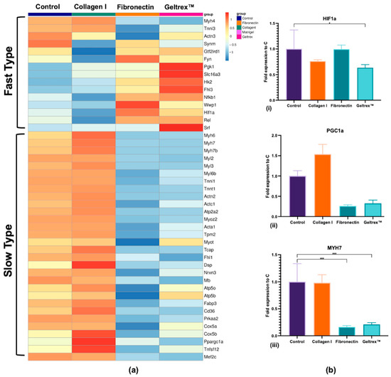 2.3. Collagen I Enhanced Slow Fiber Type Gene Expression, Whereas Fibronectin and Geltrex™ Increased Fast Fiber Type Gene Expression
