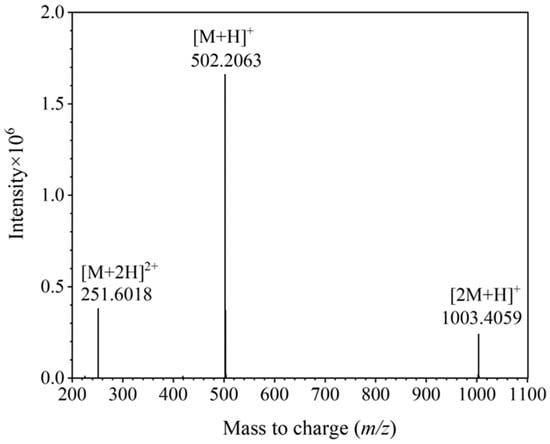 DOTA-NHS-ester was synthesized starting from 1,4,7,10-tetracyclododecane (Cyclen) via the detailed synthetic pathway presented in Figure 2. Initially, a selective modification was carried out on three of the secondary amine groups of Cyclen, which were substituted with tert-butyl acetate moieties. The process was achieved through a substitution reaction involving tert-butyl bromoacetate and the secondary amines, yielding the intermediate DO3AtBu (1). The details of the synthesis scheme are shown in the Supporting Information (SI). According to the established synthesis scheme, DOTA-NHS-ester was successfully synthesized and the theoretical molecular mass was 501.2071 (the molecular formula was C20H31N5O10). The detected molecular mass-to-charge ratio (m/z) established via ESI-Q-TOF mass spectrometry, which is shown in Figure 3, found [M + H]+ 502.2063, [M + 2H]2+ 251.6018, and [2M + H]+ 1003.4059.