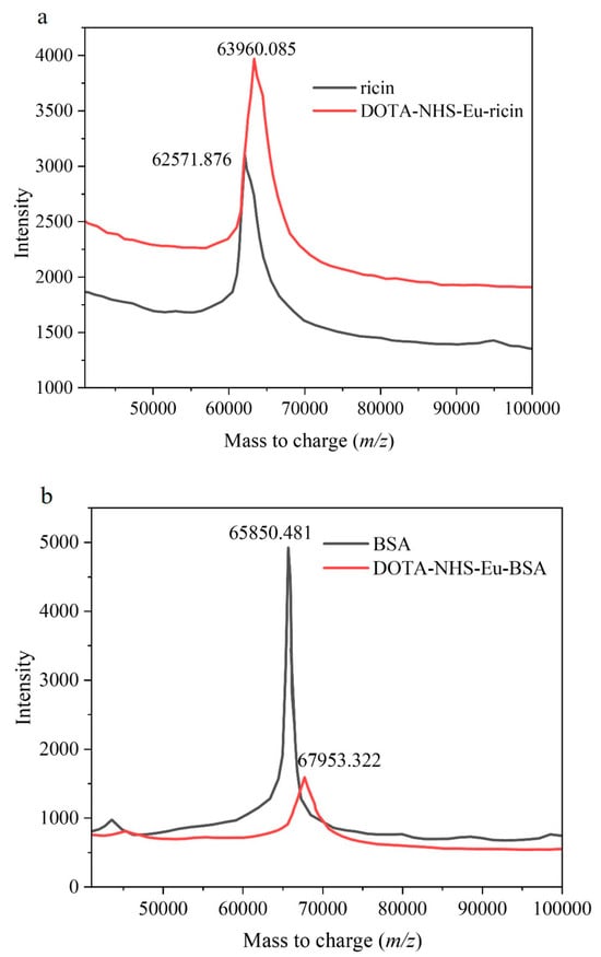 To investigate the conjugation efficiency of the synthesized DOTA-NHS-Eu with specific proteins, Ricin and BSA were labeled with DOTA-NHS-ester complexed with Eu3+. An amount of 500 μL of ricin aqueous solution and BSA aqueous solution with the same concentration of 200 mg/L were prepared. Subsequently, 100 μL of DOTA-NHS-Eu aqueous solution (1 mg/mL) was added to each sample, followed by the addition of 400 μL of a 200 mM NaHCO3 aqueous solution (pH = 8.0). The reaction was conducted at 28 °C for 3 h. After the incubation was terminated, the labeled protein conjugate was purified using an ultrafiltration centrifuge tube with a molecular weight cutoff of 10 kDa. The resulting concentrated solution was then diluted to 1 mL with a Tris-HCl buffer solution (100 mM, pH 7.4, containing 0.05% Tween 20). The labeling efficiency was evaluated by MALDI-TOF-MS analysis and the results are presented in Figure 4, revealing that each ricin molecule was labeled with two DOTA-NHS-Eu molecules, while each BSA molecule was labeled with three DOTA-NHS-Eu molecules.