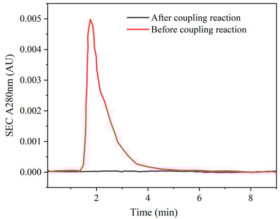 The preparation of ricin-specific enrichment magnetic beads mainly involved modifying ricin antibodies on the surface of magnetic beads through the reaction between NHS (N-hydroxysuccinimide) on the surface of the magnetic beads and the amino groups on the ricin antibodies, and then specifically enriching ricin in aqueous solutions through immune reactions and magnetic separation. In this study, NHS-activated magnetic agarose beads were conjugated with ricin antibodies. Following pretreatment with washing buffer and coupling buffer, the beads were subjected to incubation with the ricin antibody solution. Subsequently, the antibody-modified magnetic particles were isolated via magnetic separation. The amino groups present on the ricin antibodies underwent the reaction with the NHS ester groups on the magnetic beads, resulting in the formation of stable amide covalent bonds. To assess the coupling efficiency, the supernatant obtained post-conjugation was collected and subjected to analysis using size-exclusion chromatography (SEC) via gel filtration. The absorbance at A280 nm, which corresponds to the characteristic absorption wavelength of proteins, was measured. As illustrated in Figure 5, no residual antibodies could be detected in the supernatant following conjugation, thereby confirming the successful coupling of antibodies to the magnetic beads.