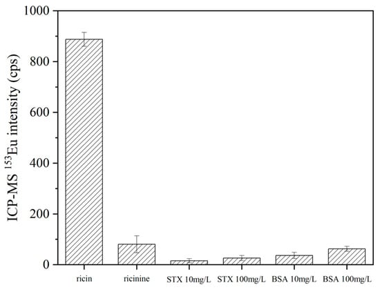 To validate the specificity and selectivity of the established sample preparation, labeling experiments were performed utilizing DOTA-NHS-Eu element tags on ricin, ricinine, bovine serum albumin (BSA), and saxitoxin (STX). Specifically, 1 μL aliquots of 10 mg/L aqueous solutions of ricin and ricinine and 10 mg/L and 100 mg/L of BSA and STX aqueous solutions were prepared, respectively. To each solution, 20 μL of immune reaction buffer and 2.5 μL of ricin antibody-modified specific enrichment magnetic beads were introduced, followed by incubation at 37 °C for 1 h. After the reaction, the magnetic beads underwent sequential washing with 200 μL of immune reaction buffer and deionized water twice. Subsequently, 50 μL of 2% HNO3 was added for elution and the mixture was allowed to react at 25 °C for 3 h under suspension conditions. The supernatant was then collected via magnetic separation. The magnetic beads were further washed twice with 50 μL of 2% HNO3, and the washing solutions were collected with the same procedure. The supernatants obtained from the aforementioned three steps were combined and diluted to a final volume of 500 μL for ICP-MS analysis. The experiment was repeated and analyzed independently (n = 6) the same day. As depicted in Figure 7, the results revealed that the signal responses of ricinine, BSA, and STX were all below 10% of the ricin response, thereby demonstrating that the specifically prepared ricin enrichment magnetic beads exhibited exceptional selectivity.
