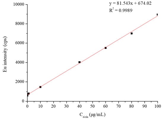 The metal element chelated tag (MECT) had gained widespread application in the field of biomarker analysis in conjunction with mass spectrometry due to the excellent stability, cost-effective labeling reagents, and straightforward operational process. These qualities supplied the technical demands of protein quantification []. The method of MECT extended across various mass spectrometry platforms, encompassing ionization techniques like ESI-MS and MALDI-TOF-MS, as well as inorganic mass spectrometry, notably inductively coupled plasma mass spectrometry (ICP-MS). Its capacity to precisely quantify proteins or polypeptides had increasingly demonstrated its advantages in protein quantitative research. ICP-MS offered significant benefits in the determination of metal elements []. The low detection limit, a wide linear range, and the ability to simultaneously detect multiple elements allowed its widespread application in the analysis of most metal elements. The method had also been widely applied in antigen–antibody immunoassays in the past decades []. By labeling antibodies or antigens with metal elements and exploiting the specific noncovalent binding between them, metal elements could be indirectly tagged to the antigen or antibody of interest. The approach eliminated the need for complex chromatographic separation techniques, instead leveraging the high sensitivity and accuracy of ICP-MS in simultaneously quantifying multiple metal elements to achieve antigen quantification [,]. The immunoassay technology utilizing ICP-MS based on metal element labeling exhibited clear advantages, including high sensitivity, precision, and accuracy [,]. In this study, we aimed to develop a trace analysis method for ricin that combines metal element labeling with immunity-enrichment and ICP-MS technology. The specific detection technique was successfully established for ricin, offering an alternative method for the specific identification and accurate quantification of ricin in various complex matrices.
