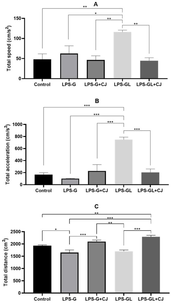 Mean ± SEM. Effects of cherry juice in maternal infection by lipopolysaccharide on the behavioral response of adult P90 rats in the open field (OP) test. (A) Total speed; (B) Total acceleration; (C) Total distance. * p < 0.01, ** p < 0.001, *** p < 0.0001. (Tukey’s post hoc). n = 6. LPS-G: LPS during gestation, LPS-G+CJ: LPS during gestation + cherry juice, LPS-GL: LPS during gestation-lactation, LPS-GL+CJ: LPS during gestation-lactation + cherry juice.