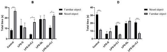 Mean ± SEM. Effects of cherry juice in maternal infection by lipopolysaccharide on the behavioral response of adult P90 rats in the novel object recognition (NOR) test. (A) Total numbers of interactions in short-term memory (STM); (B) Total time of interaction in short-term memory (STM); (C) Total numbers of interactions in long-term memory (LTM); (D) total time of interaction in long-term memory (LTM). * p < 0.01, ** p < 0.001, *** p < 0.0001 (Tukey’s post hoc). n = 6. LPS-G: LPS during gestation, LPS-G+CJ: LPS during gestation + cherry juice, LPS-GL: LPS during gestation-lactation, LPS-GL+CJ: LPS during gestation-lactation + cherry juice.