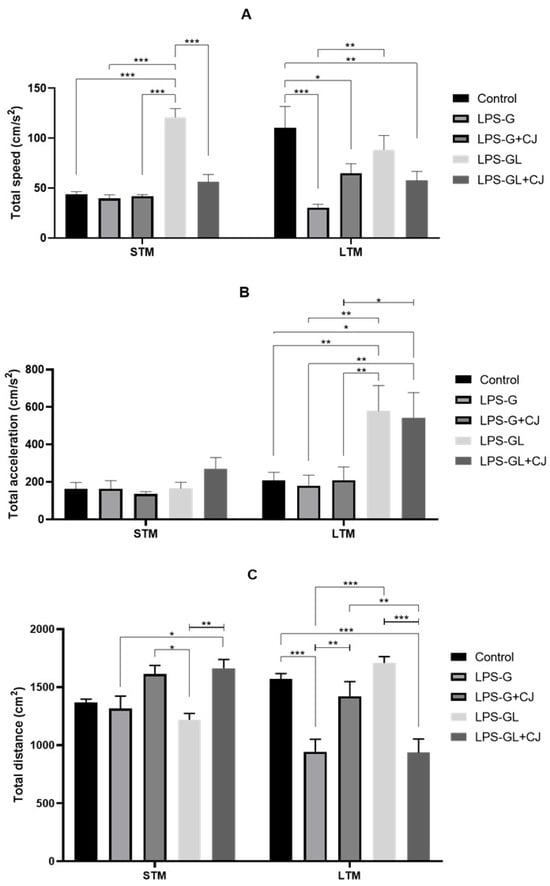 During the NOR test, the LPS-G and LPS-GL groups interacted and spent more time with familiar objects during the STM (F4,25 = 6.84, p = 0.0007) and LTM (F4,25 = 6.01, p = 0.0016) phases, whereas the LPS-G+CJ and LPS-GL+CJ groups interacted and spent more time with novel objects, being statistically equal to the control group during the STM (F4,25 = 6.21, p = 0.0013) and LTM (F4,25 = 19.26, p < 0.0001) phases (Figure 2). In addition, during the STM phase, the LPS-GL group showed an increase in total speed compared to the experimental groups (F4,50 = 7.00, p = 0.0001). However, the LPS-G+CJ and LPS-GL+CJ groups were statistically equal to the control group (p < 0.05). On the other hand, during the LTM phase, all experimental groups showed lower values for total speed than the control group (F4.50 = 7.99, p < 0.0001) (Figure 3A). Moreover, during the LTM phase, the LPS-GL and LPS-GL+CJ groups showed an increment in total acceleration compared to the control group (F4,50 = 2.74, p = 0.0387) (Figure 3B). With respect to the total distance, the offspring of the LPS-GL+CJ group showed an increase compared to the LPS-GL group during the STM phase (F4,50 = 5.22, p = 0.0048). However, the LPS-GL+CJ group showed a decrease in total distance compared to the LPS-GL group during the LTM phase (F4,50 = 9.05, p < 0.0001). In addition, the LPS-G and LPS-GL groups decreased the total distance compared to the control group (F4,50 = 15.68, p < 0.0001) (Figure 3C).