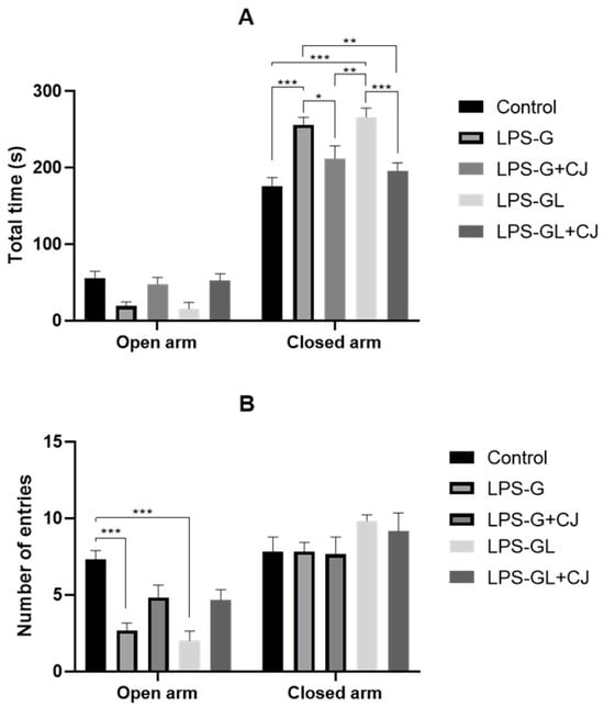 For the EPM test, no significant differences were observed in the time spent in open arms for any of the experimental groups. However, the LPS-G and LPS-GL groups were statistically different from the control, LPS-G+CJ and LPS-GL+CJ groups in the time spent in the closed arms (F4,50 = 15.13, p < 0.0001) (Figure 4A). In addition, the LPS-G and LPS-GL showed significant differences in the number of entries to the open arm compared to the control group (F4,50 = 6.08, p = 0.0005) (Figure 4B).
