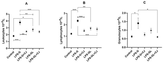The LPS-G and LPS-GL groups showed a significant increase in total leukocytes compared to the control group (F4,25 = 12.33, p < 0.0001). However, the LPS-G+CJ group was statistically equal to the control group (p < 0.05) (Figure 5A). As for total lymphocytes, only the LPS-G group showed a significant difference from the control group, but the administration of cherry juice decreased these values in the LPS-G+CJ group (F4,25 = 13.86, p < 0.0001) (Figure 5B). Total granulocytes also showed an increase for LPS-G group compared to the control group (F4,25 = 4.85, p = 0.0162) (Figure 5C).