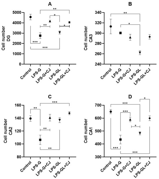 Mean ± SEM. Effects of cherry juice in maternal infection by lipopolysaccharide on hippocampal cell count. (A) Number of total cells in the dentate gyrus; (B) Number of total cells in the CA3; (C) Number of total cells in the CA2; (D) Number of total cells in the CA1. * p < 0.01, ** p < 0.001, *** p < 0.0001. (Tukey’s post hoc). n = 4. LPS-G: LPS during gestation, LPS-G+CJ: LPS during gestation + cherry juice, LPS-GL: LPS during gestation-lactation, LPS-GL+CJ: LPS during gestation-lactation + cherry juice.