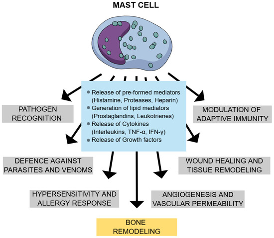 Mast cells (MCs) are specialized immune cells that are recognized for their role in maintaining immune homeostasis and are central to the pathogenesis of several diseases, including mastocytosis. These cells originate from multipotential stem cells in the bone marrow and yolk sac. Immature mast cells circulate throughout the body and migrate into tissues, where they differentiate into functional forms and reside [1,2,3]. Mast cells express diverse surface and cytoplasmic receptors, such as FcεRI, KIT, mas-related G protein-coupled receptor X2 (MRGPRX2), Toll-like receptors (TLRs), and complement receptors, that enable them to detect and respond to immunologic and non-immunologic stimuli. Activation may occur via IgE-mediated FcεRI crosslinking or through direct stimulation by microbes, drugs, enzymes, or physical factors. Upon activation, mast cells release pre-formed mediators (e.g., histamine, proteases, heparin) via degranulation and generate lipid mediators (e.g., prostaglandins, leukotrienes) and cytokines de novo [2,4,5]. These mediators contribute to inflammation, tissue remodeling, angiogenesis, and immune regulation [4,6,7]. Their adaptability and signaling abilities make mast cells crucial defenders and regulators in healthy physiology. They support both innate and adaptive immunity, help control infections and regulate inflammation. In the gut, they aid microbiome balance by influencing IgA and T and B cell maturation [8]. Mast cells contribute to host defense by recognizing and responding to a broad spectrum of pathogens, including bacteria, parasites, and fungi [4]. They mediate antimicrobial activity through the release of bioactive mediators, including antimicrobial peptides. Additionally, mast cell-derived proteases, including tryptase and chymase, facilitate the degradation and inactivation of exogenous toxins, such as those found in insect and snake venoms [4,9]. Mast cells are also essential for wound healing—guiding inflammation, tissue repair, and angiogenesis [10]. In blood vessels, they mediate vasodilation and vascular remodeling. Additionally, they support bone remodeling and mineral balance [11]. Figure 1 summarizes the physiological actions of mast cells.