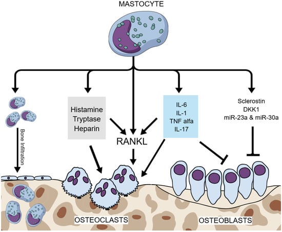 Several MC mediators are known to have a key role in bone metabolism. Neoplastic infiltration or the local release of mediators, such as histamine, heparin, tryptase, cytokines, and lipid mediators, has been suggested as the cause of skeletal alteration in SM [17]. Compared to healthy controls, patients with mastocytosis-induced bone density loss were shown to have higher levels of serum tryptase, IFN-γ, IL-1β, and IL-6 [32]. Tryptase induces the production of metalloproteases, which enhance bone resorption; cytokines, such as TNF-α, IL-1β, and IL-6, promote osteoclastogeneses and/or osteoclastic function; and histamine, prostaglandin, tryptase, heparin and platelet-activating factor activate the RANKL-induced pathway, all of which is known to promote osteoclastogenesis and, therefore, stimulate bone resorption [32]. Histamine metabolites have been shown to act on both osteoclasts and their precursors via autocrine and paracrine pathways, increasing osteoclastic activity and the risk of osteoporotic manifestation [52]. Figure 2 summarizes the pathophysiological mechanisms of ISM-induced osteoporosis.
