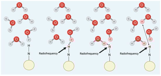CEST mechanism. Radiofrequency is used to saturate an amine group present in a substance, which reduces the signal of that substance. As a result, a saturated hydrogen proton is transferred to water. The process then continues with a concurrent reduction in the water signal. Adapted from [1]. reated in BioRender. Bach, H. (2025) https://BioRender.com/h42n006.