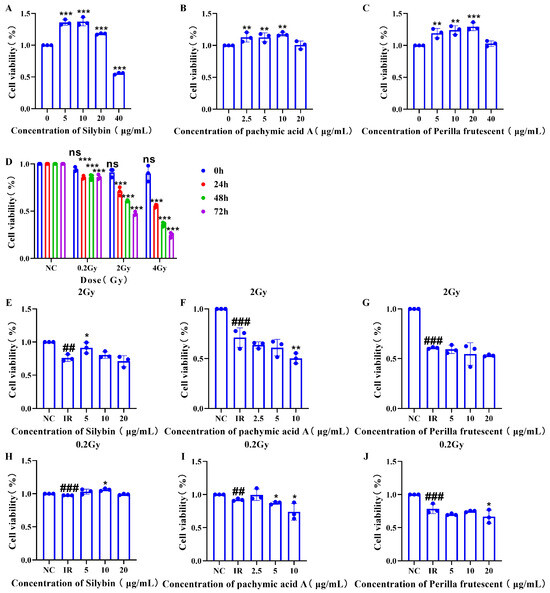 Proliferative viability of RAW264.7 cells after intervention with three natural products. (A–C) no irradiation, samples collected 48 h after intervention; (D) irradiation alone; (E–G) irradiation at 2 Gy, samples obtained 48 h post-irradiation; (H–J) irradiation at 0.2 Gy, samples acquired 48 h post-irradiation. The three natural products are silybin, pachymic acid A, and perilla proanthocyanidins. Data are presented as mean ± SEM. * p < 0.05; ** p < 0.01; *** p < 0.001; ## p < 0.01; ### p < 0.001; ns p > 0.05.