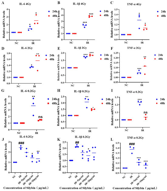 mRNA expression of inflammatory factors in RAW264.7 cells under irradiation conditions. (A–I) Irradiation alone: samples were collected 24 and 48 h after 4 Gy, 2 Gy, and 0.2 Gy irradiation, and the IL-6, IL-1β, and TNF-α mRNA levels in RAW264.7 cells were measured. (J–L) IL-6, IL-1β, and TNF-α mRNA levels in samples collected 24 h after 0.2 Gy irradiation combined with silybin intervention. Data are presented as mean ± SEM. ## p < 0.01; ### p < 0.001; * p < 0.05; ** p < 0.01; *** p < 0.001; ns p > 0.05.